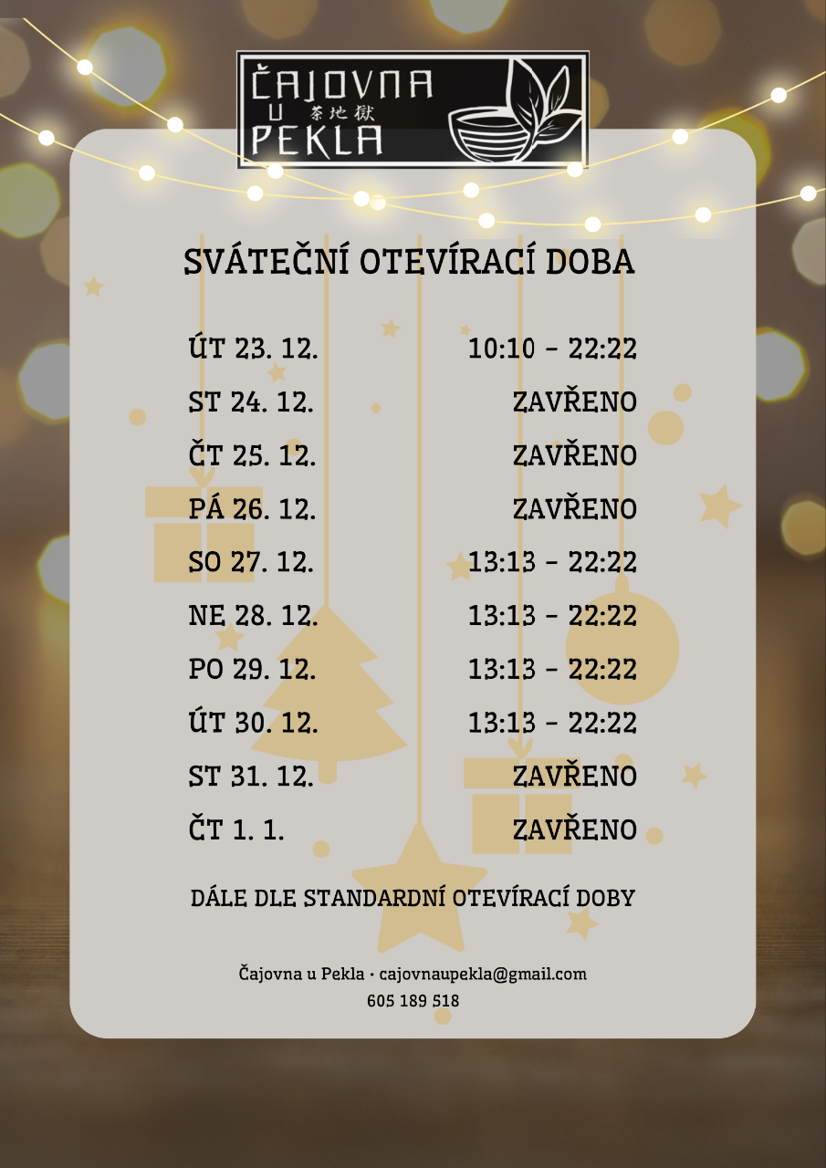 Vánoční otevírací doba 23.12.2025 09:29 Vážení hosté, přikládáme otevírací dobu o Vánocích. A přejeme Vám poklidně strávené svátky, hlavně zdraví a ať se Vám splní všechna přání. A až si budete chtít odpočinout, rádi vás pohostíme v čajovně. Těšíme se na Vás.
